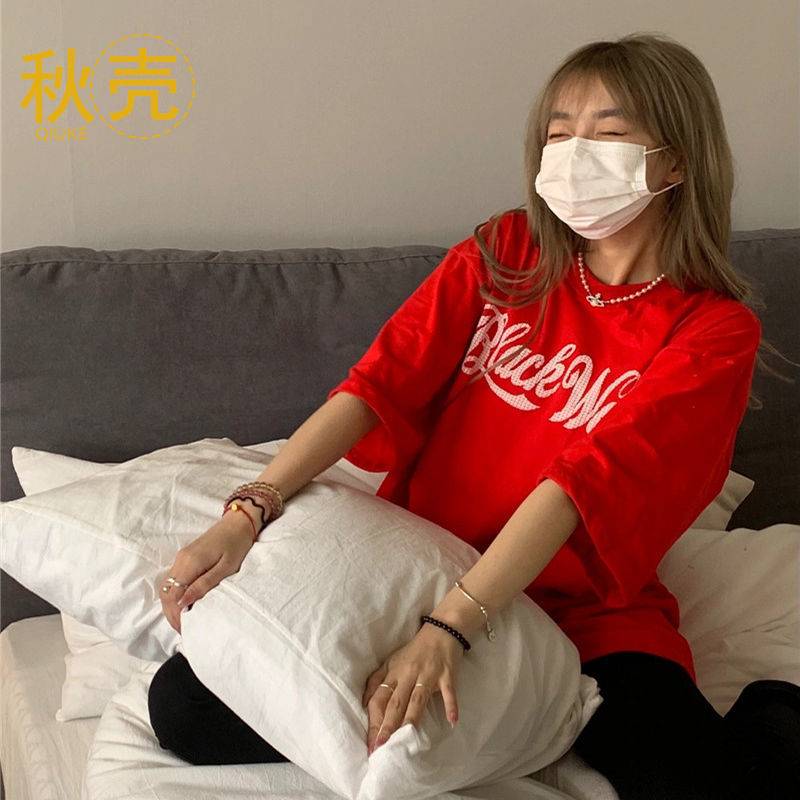 100%纯棉美式复古红色短袖T恤女夏季ins潮宽松原宿风oversize上衣