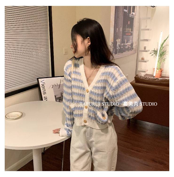 韩系百搭针织开衫外套女秋季2022年新款V领条纹复古长袖上衣ins风