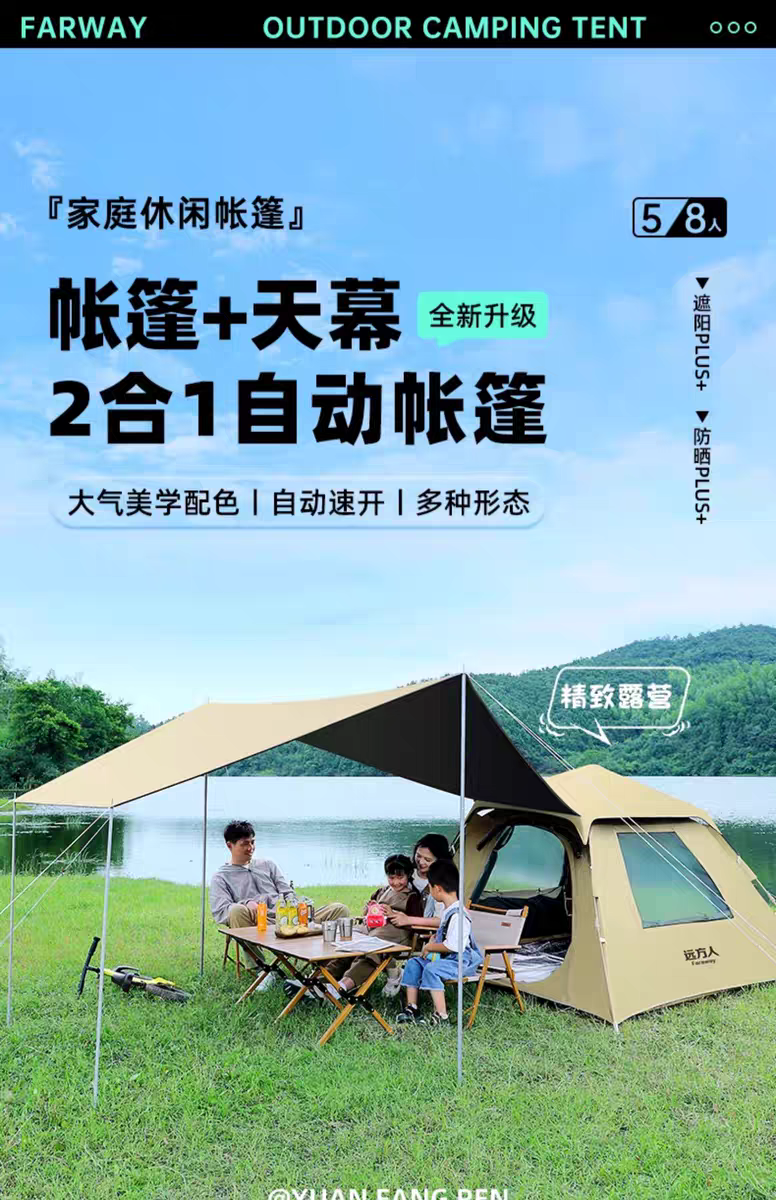 帐篷天幕二合一户外折叠便携式野营过夜露营加厚防雨黑胶装备全套