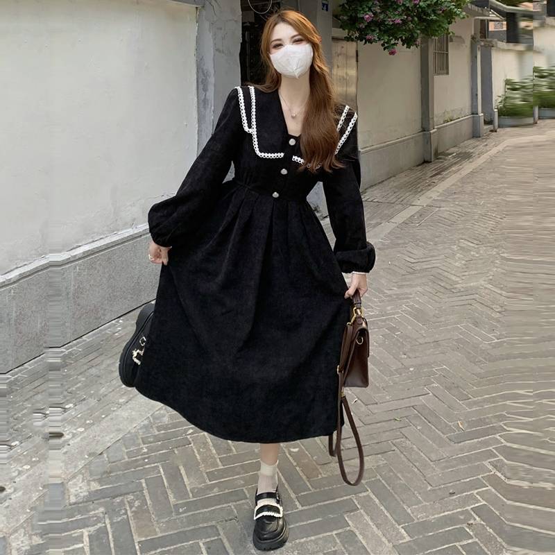 法式复古长袖连衣裙新款早秋韩国黑裙宽松女装