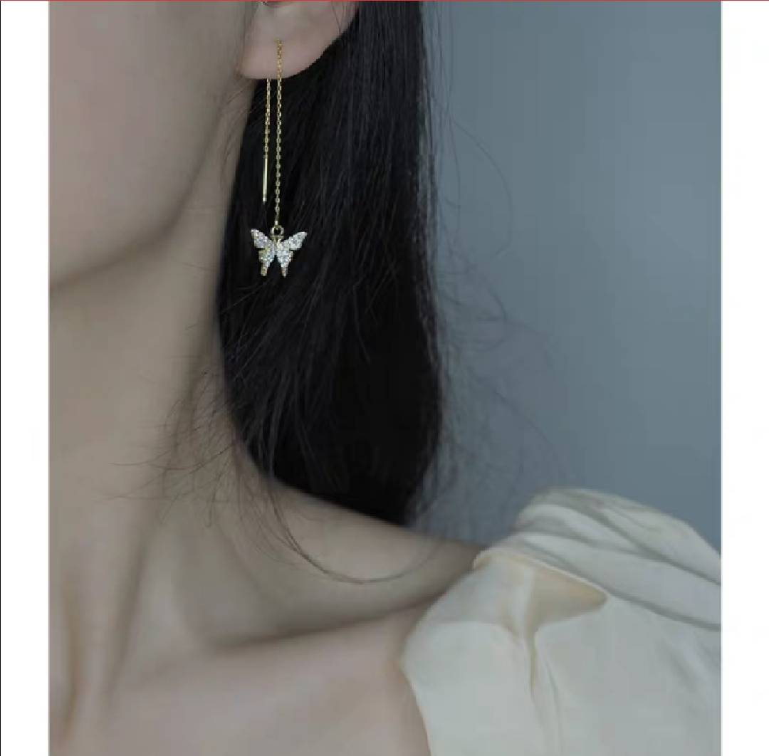 hzyeyuan手作满钻大蝴蝶耳线925纯银流苏长耳环日韩饰品女005166