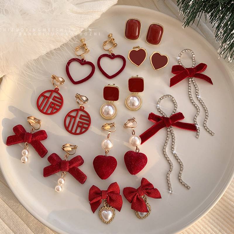 高级感酒红色蝴蝶结耳夹无耳洞耳环女2022年秋冬新款气质简约耳饰