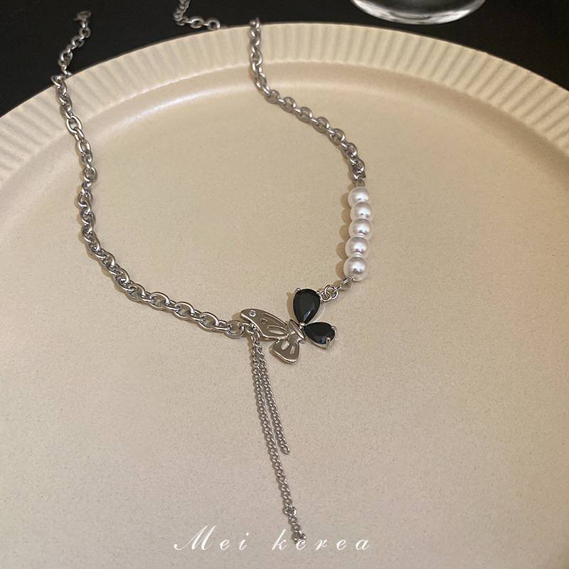 冷淡风气质镂空蝴蝶镶钻珍珠拼接项链网红ins毛衣链甜酷辣妹项饰