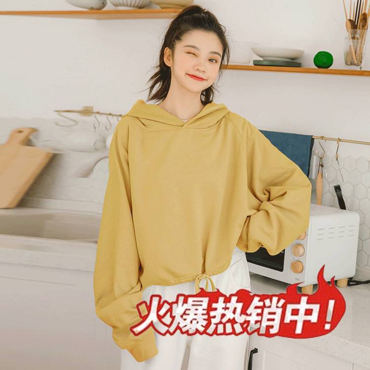 2023春季新款ins韩版宽松纯色连帽系带短款全棉卫衣
