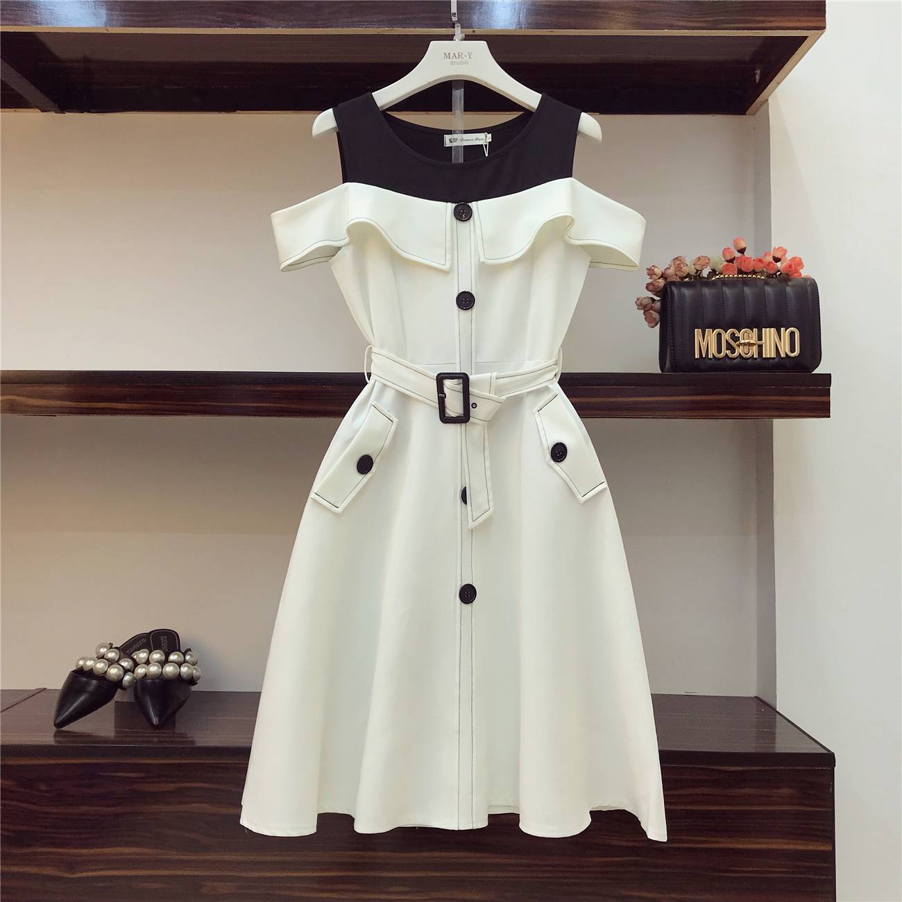 ins超HOT极简冷淡风pphome连衣裙2018夏季新款气质漏肩收腰中长裙