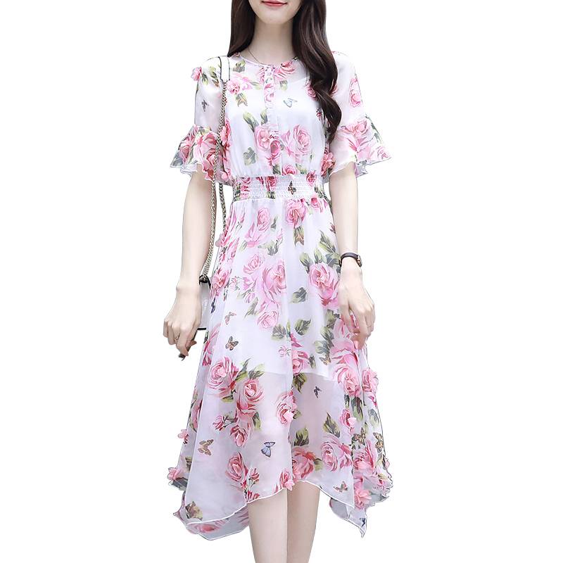 2018夏装新款韩版收腰显瘦仙女裙子气质中长款雪纺印花连衣裙女夏