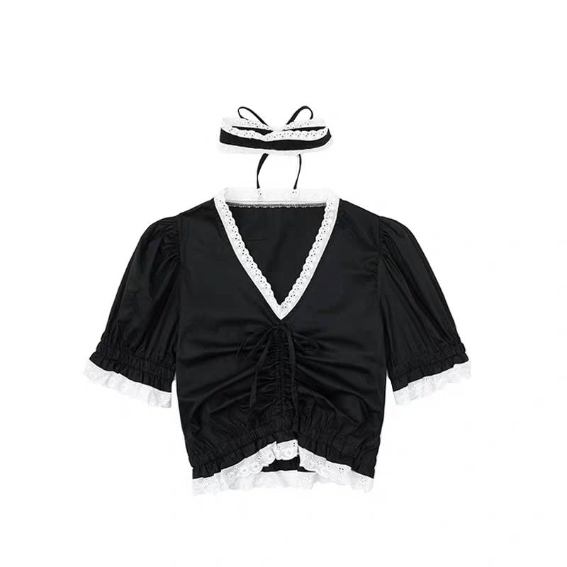 E家自制夏复古暗黑萝莉抽绳蕾丝花边泡泡袖衬衣显瘦超短露脐上衣
