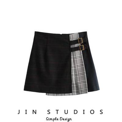 自制高腰复古格子拼色不规则短裙显瘦百搭防走光A字半身裙打底