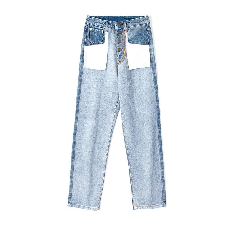 设计感反穿拼色单排扣高腰牛仔裤显瘦百搭减龄长裤