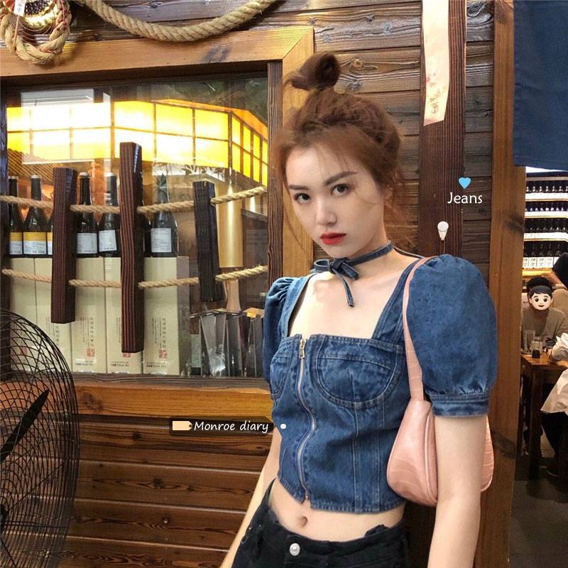 露脐短款牛仔衬衫设计感2020新款夏季女短袖泡泡袖小众方领上衣潮