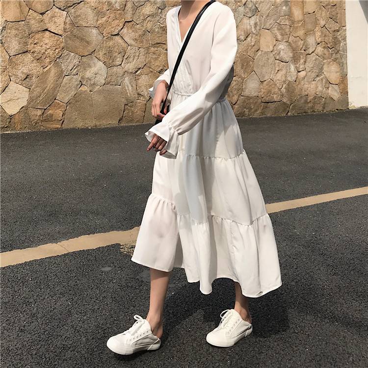 赫本风气质荷叶袖闺蜜连衣裙韩版宽松V领中长裙长袖仙女裙子