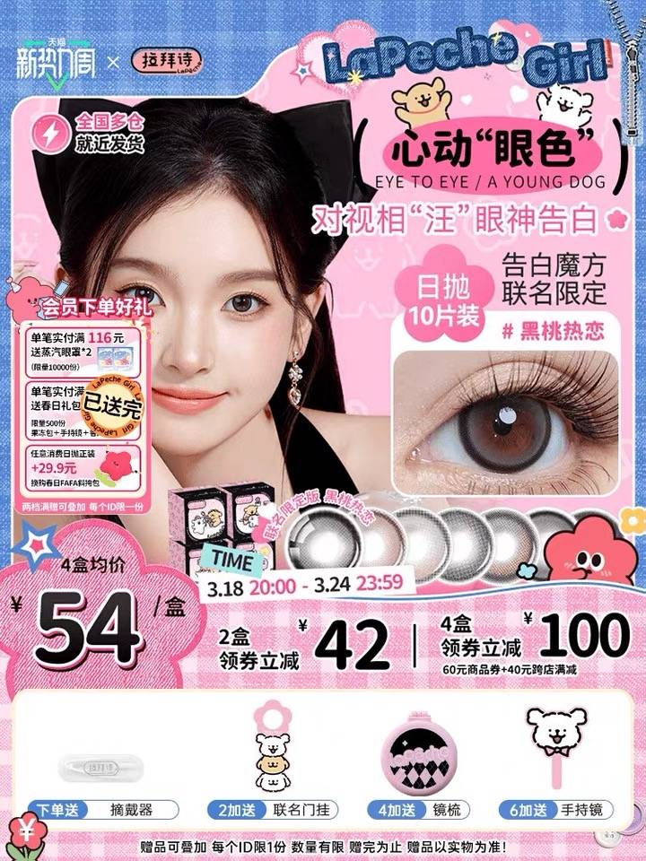 拉拜诗线条小狗美瞳日抛告白魔方小方盒微混血感隐形眼镜10片正品