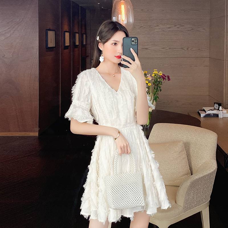 很仙的法式复古过膝裙子女2020新款百搭简约V领a字裙雪纺连衣裙夏