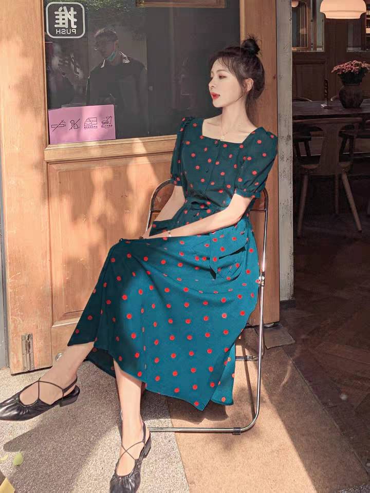2020夏季新款品牌女装v领波点荷叶边裙气质轻熟雪纺连衣裙