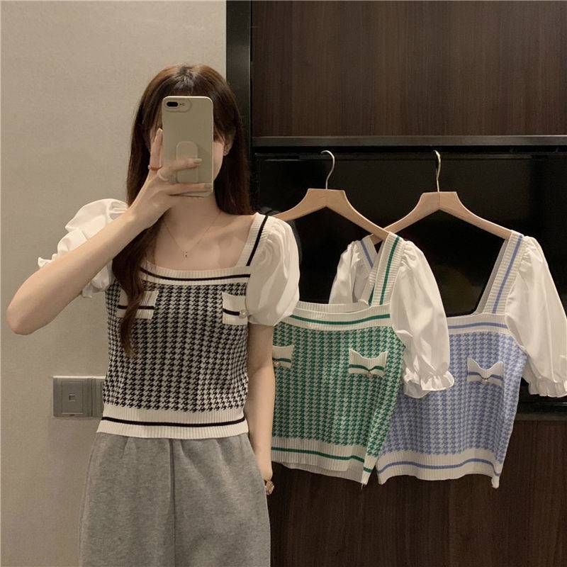 夏季2023新款修身显瘦方领千鸟格短袖衬衫女设计感小众短款上衣(包邮)