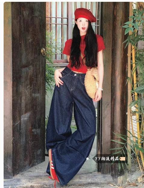 复古深蓝色牛仔裤女夏季2025新款小个子高腰宽松垂感阔腿拖地长裤