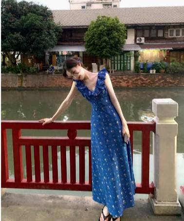 法式复古风蓝色碎花连衣裙女春夏季装新款V领无袖收腰显瘦长裙子