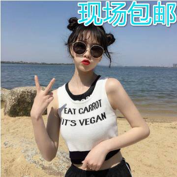 港味chic复古字母印花针织吊带背心女夏短款打底衫