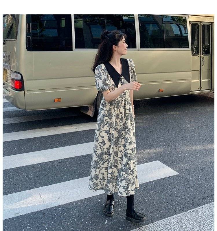 2021夏季新款法式桔梗连衣裙女收腰显瘦泡泡袖初恋裙复古港味裙子