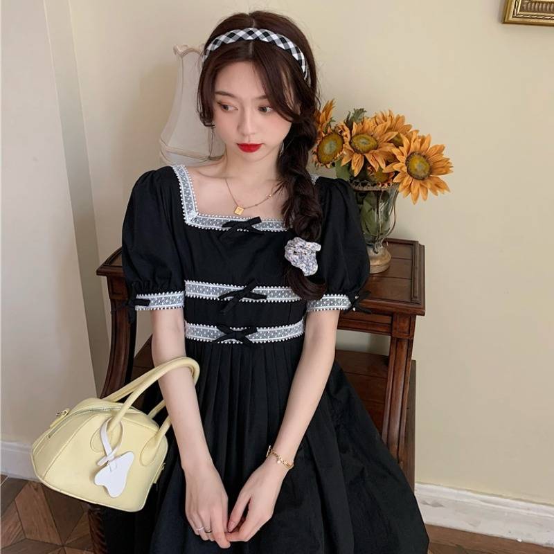 港风chic复古蝴蝶结收腰法式连衣裙女小众夏季ins小黑裙2021新款