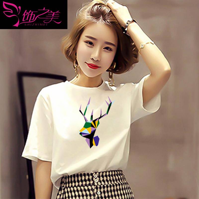 气质短袖T恤女2023新款女装夏季韩版宽松大码体恤纯色印花上衣潮