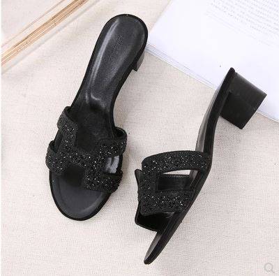 2018新款夏季真皮H拖鞋黑色水钻高跟鞋粗跟外穿凉拖女半拖凉鞋女