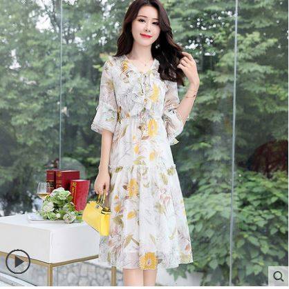 碎花雪纺连衣裙女中长款夏季2018新款女装喇叭袖收腰气质印花裙子