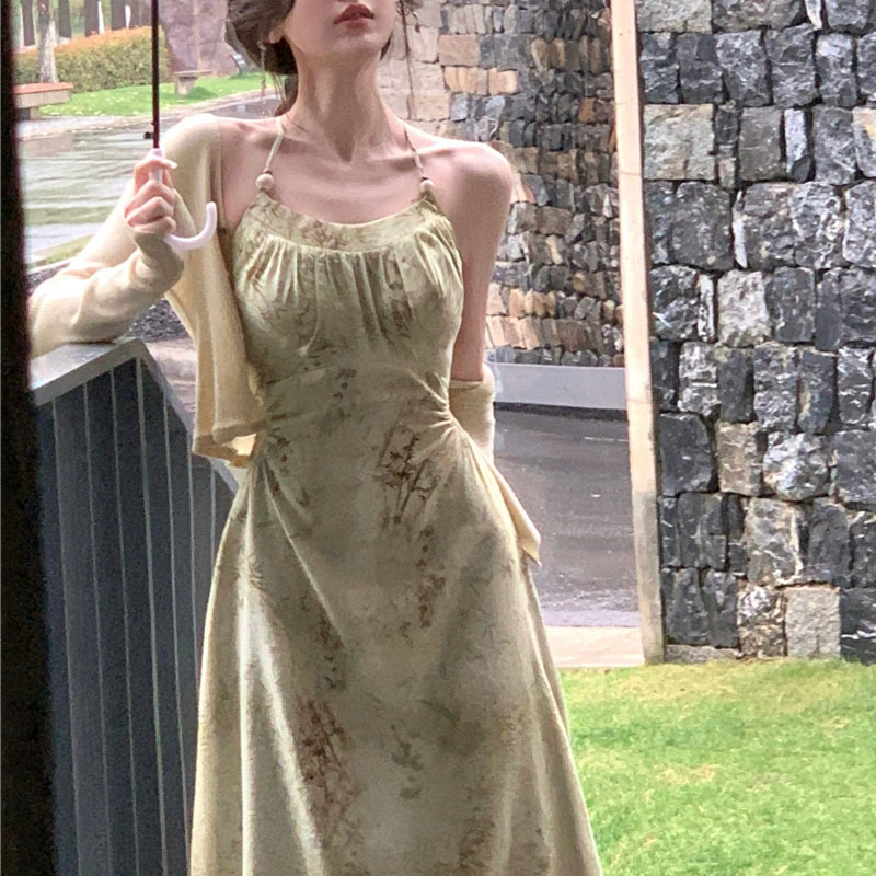 级感印花挂脖吊带连衣裙夏季2023女新款气质温柔露腰性感长裙子