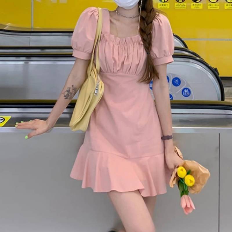 新款连衣裙修身显瘦法式荷叶边粉色连衣裙夏季新款方领泡泡袖A字可温柔可爱高腰小个子短裙子
