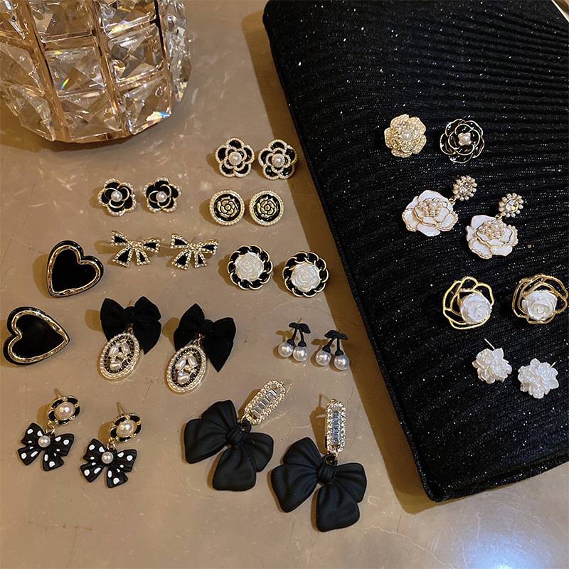 气质黑色山茶花珍珠耳环高级感耳钉复古小香风法式925银针耳饰女