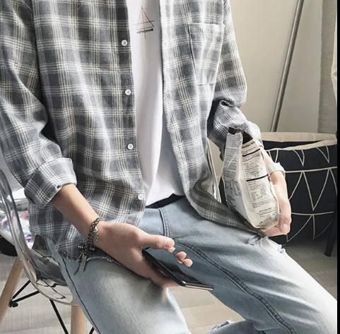 ulzzang原宿港风宽松格子衬衫男长袖韩版潮流休闲学生加绒衬衣男