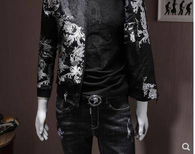 品男士夹克衫棒球服复古花纹绣花修身青年男装开衫衣服