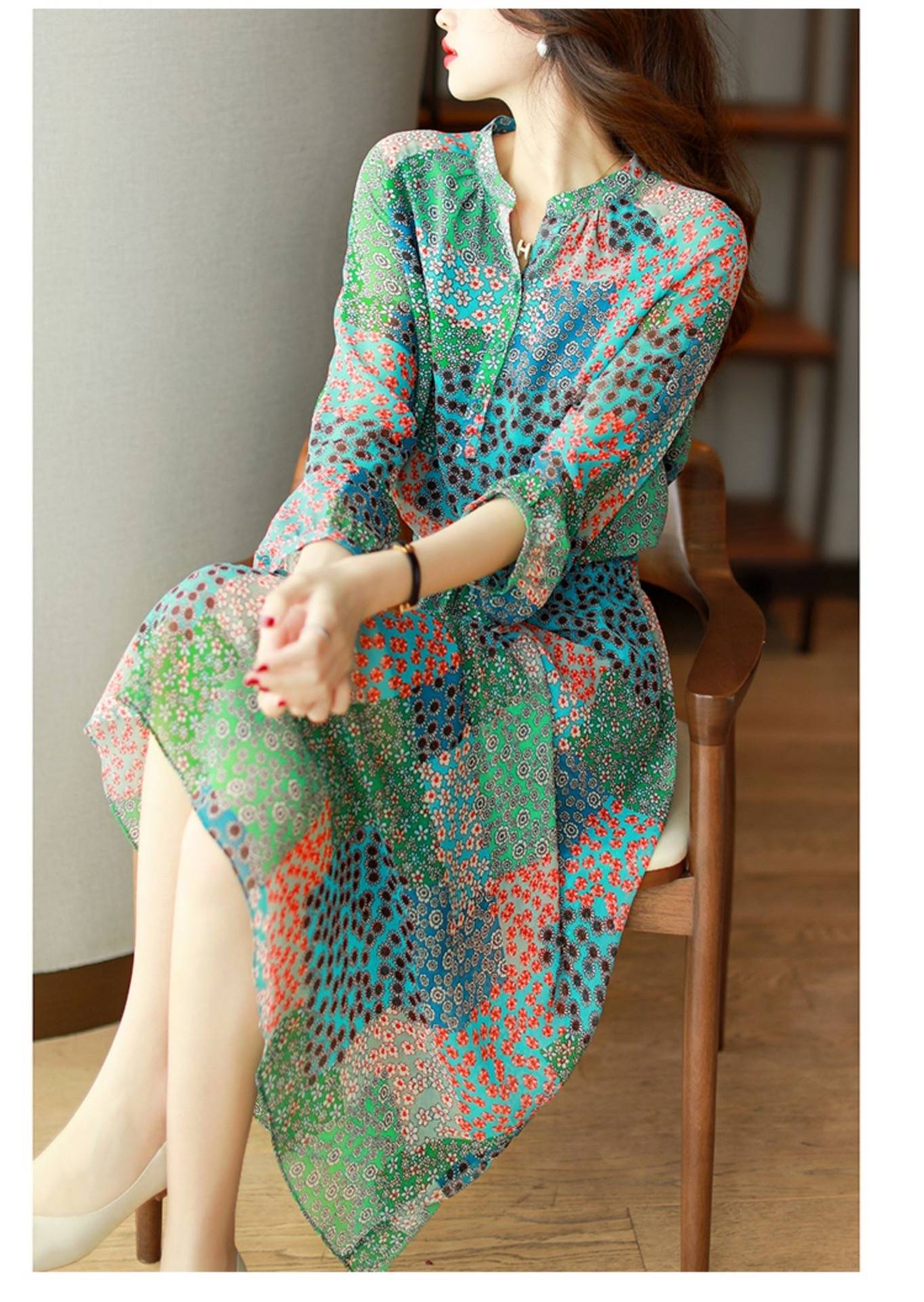 高端真丝连衣裙春夏女装长袖气质碎花裙子100%桑蚕丝长裙全国包邮