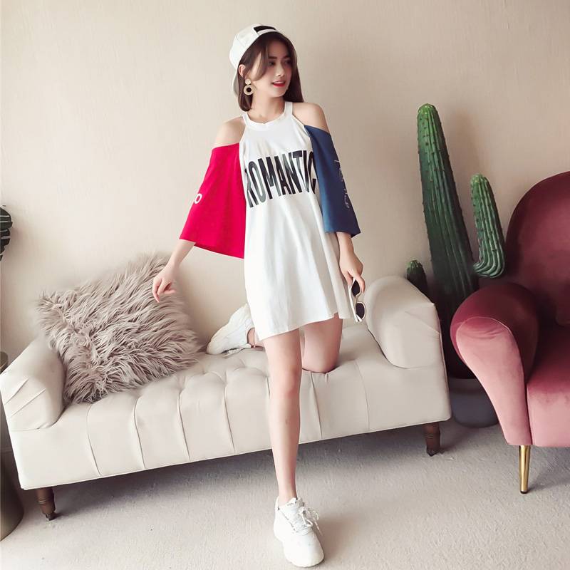 t恤女夏装2018新款韩范短袖宽松中长款下衣失踪挂脖露肩字母上衣