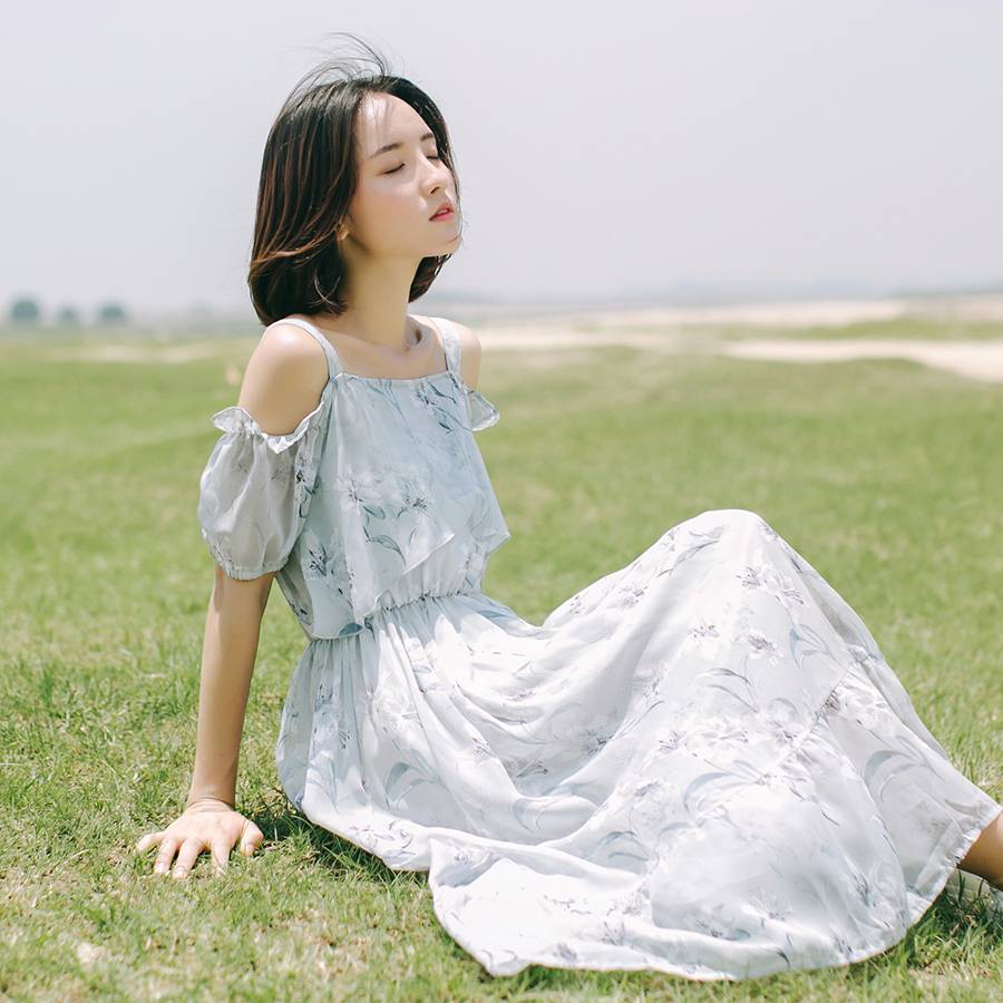 小清新吊带裙女夏中长款荷叶边收腰显瘦露肩气质学生碎花连衣裙潮