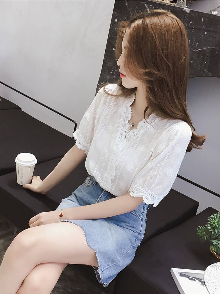 夏装2018新款V领花边灯笼袖白色洋气蕾丝衬衫女百搭超仙两件八折