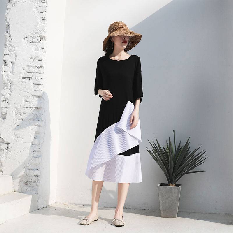2018下摆不规则拼接开叉宽松连衣裙女夏季中长款显瘦短袖t恤裙子