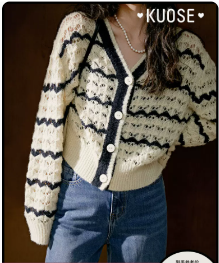 阔色镂空开衫薄毛衣外套2022秋新款女慵懒条纹针织衫韩系上衣预售