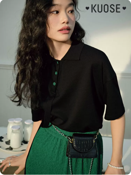 阔色黑色设计感短袖t恤女新款夏装小众蓝色翻领Polo衫上衣绿