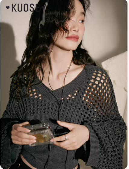 阔色黑色镂空罩衫两件套女上衣2022新款秋v领长袖针织衫套装