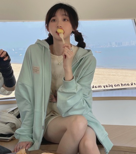 绿色开衫连帽卫衣外套女2022年春秋季薄款日系小个子上衣