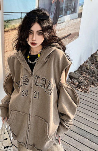 美式复古水洗做旧破洞可拆卸连帽衫卫衣女情侣开衫外套