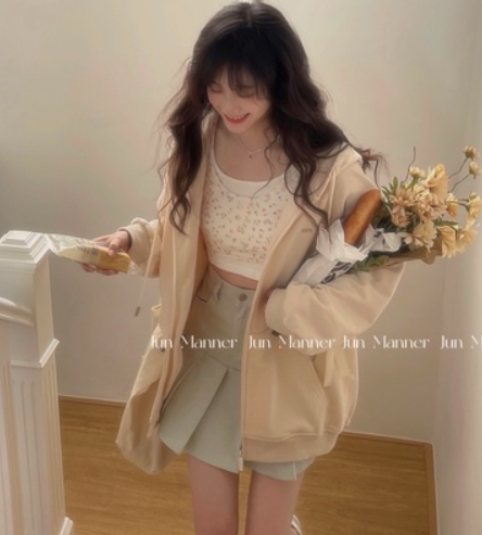 杏色连帽卫衣外套女春季日系复古宽松小个子