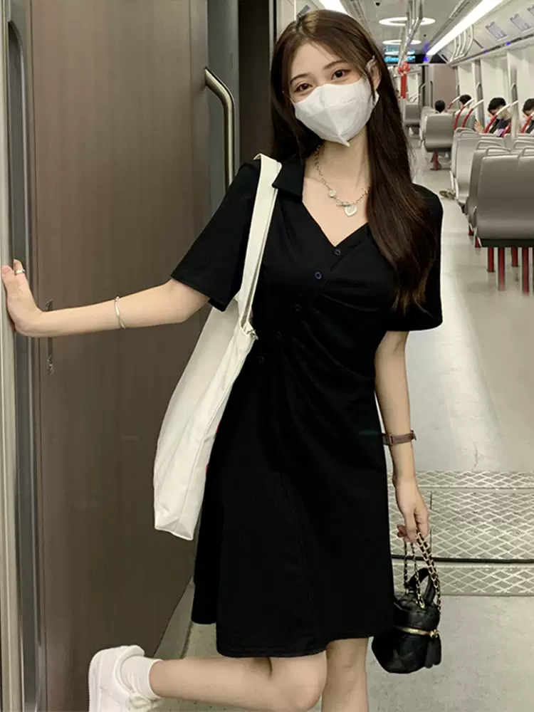 Polo领灰色连衣裙女夏季新款修身显瘦法式茶歇短裙