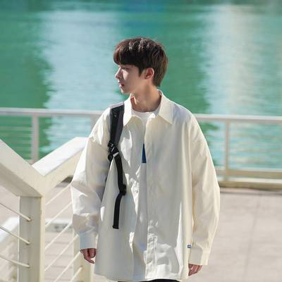 春秋装长袖衬衫贴标纯色衬衣港味宽松学生基础款打底衫男生外套