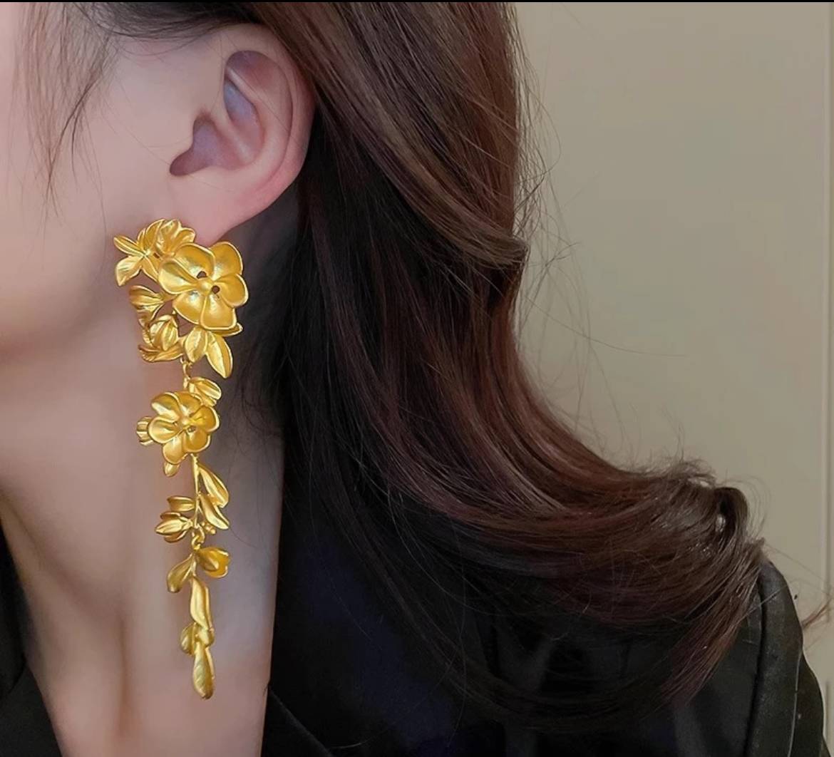 铜合金耳饰 金色花朵流苏耳环高级感夸张显脸瘦耳钉耳饰 五金女孩