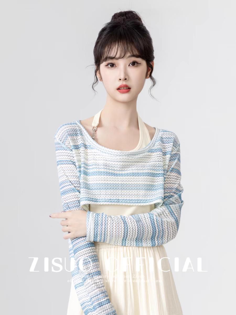 短款条纹防晒冰丝针织衫女2024夏新款挂脖吊带背心罩衫两件套上衣