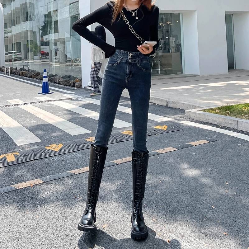秋季高腰牛仔裤女2021年新款春秋显瘦紧身秋冬ins加绒小脚裤子潮
