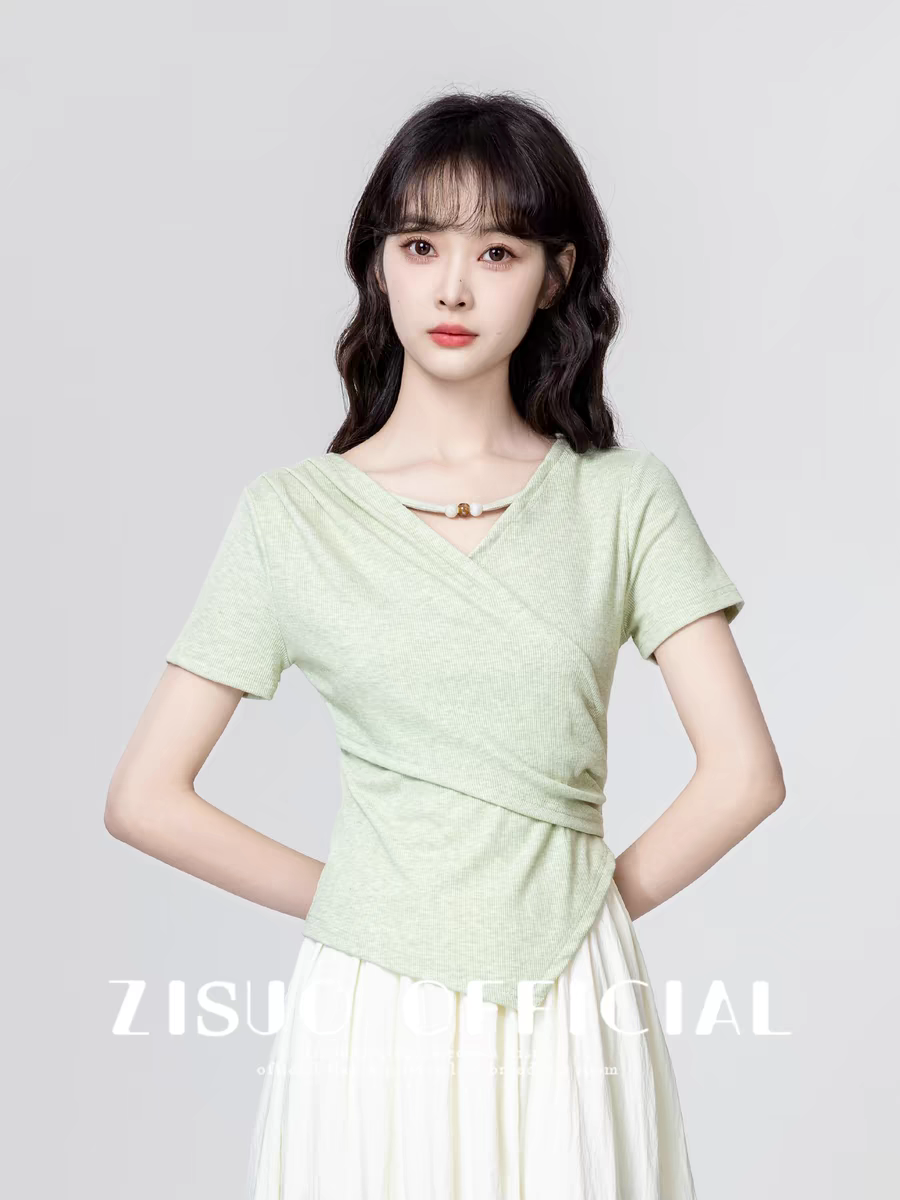 绿色V领短袖T恤女夏季2024新款不规则交叉收腰显瘦正肩体恤短上衣