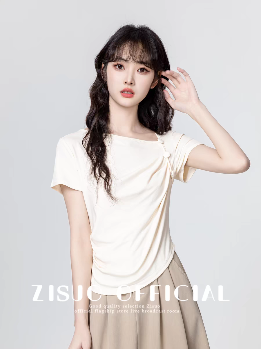 杏色不规则短袖T恤女2024夏季新款设计感收腰显瘦正肩体恤短上衣